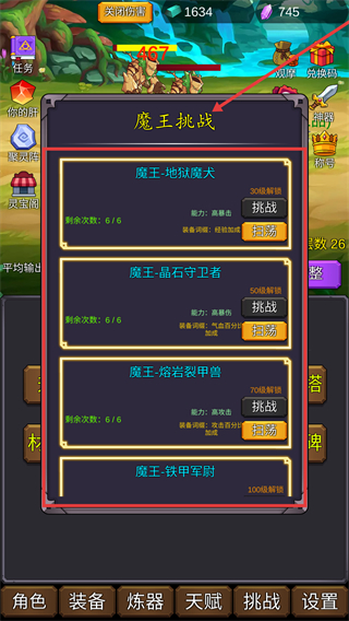 2、在【魔王挑戰】中解鎖對應等級的魔王,如【地獄魔犬】,利用剩余次數挑戰獲取裝備詞綴加成。