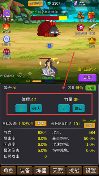 3、分配屬性點時優先提升【體質】和【力量】,點擊確認按鈕強化角色戰斗屬性提高輸出效率。