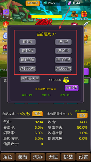 4、根據當前層數選擇【進1層】或【進10層】按鈕,快速推進層數獲取更高經驗和靈石獎勵。