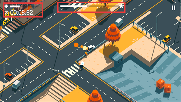 3、對局中操控車輛躲避障礙,界面顯示計時【00:08.82】,需保持存活推進游戲時長。