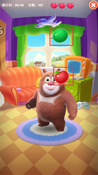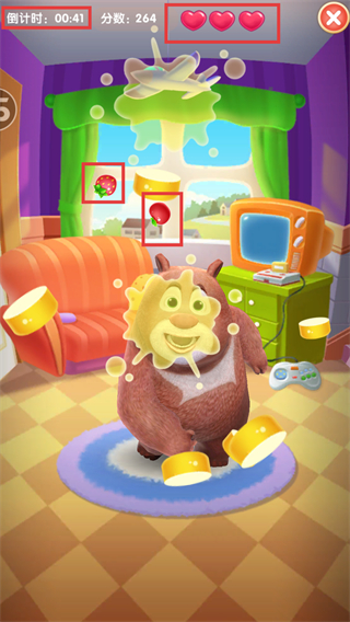 3、在【00:41】倒計時內(nèi),繼續(xù)點擊【草莓】【蘋果】等物品,提升分?jǐn)?shù)至【264】,保持界面頂部的【愛心】數(shù)量。