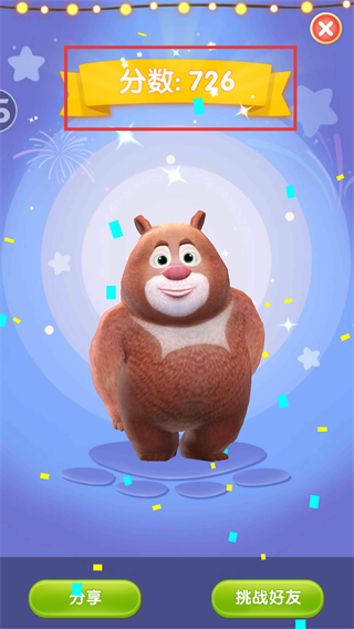 4、完成物品收集后,獲得最終【分?jǐn)?shù):726】,可選擇【分享】或【挑戰(zhàn)好友】按鈕,結(jié)束本輪互動玩法。