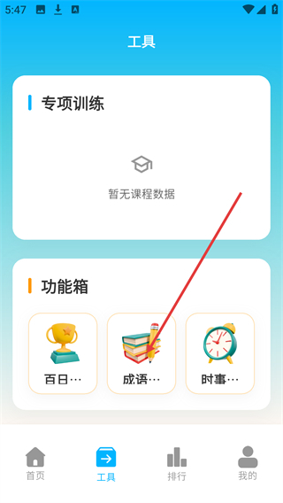 2、切換到【工具】頁面,找到【功能箱】板塊里的【成語…】選項,點擊進入對應功能頁面。