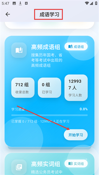 3、進入【成語學習】頁面,點擊【開始學習】按鈕即可開啟學習。