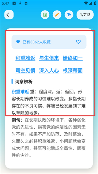 4、進入學習頁后,可查看【積重難返】等成語的詞意辨析,還能看到對應的例句輔助理解。