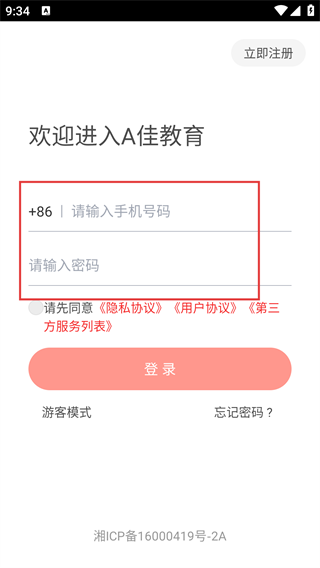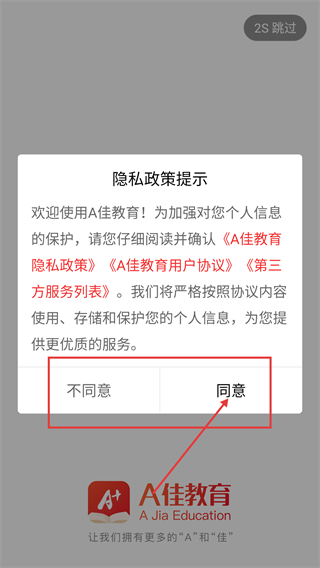 1、進(jìn)入軟件后會(huì)彈出【隱私政策提示】,查閱【A佳教育隱私政策】等協(xié)議后,點(diǎn)擊【同意】按鈕。