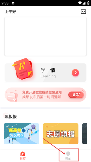 2、進(jìn)入軟件首頁(yè)后,可查看【學(xué)情-Learning】等功能,還能開(kāi)通微信成績(jī)提醒,點(diǎn)擊底部導(dǎo)航欄的【我的】進(jìn)入個(gè)人中心。