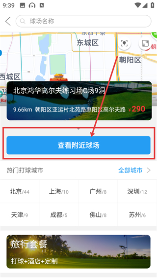 2、進入球場頁面后,點擊【查看附近球場】按鈕,就能獲取當前位置周邊的高爾夫球場列表哦。