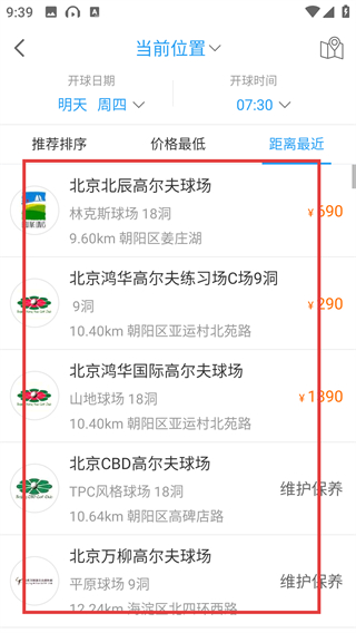 3、在附近球場列表頁,可按距離最近等條件排序,查看各球場的洞數、價格等信息,方便挑選合適的場地。