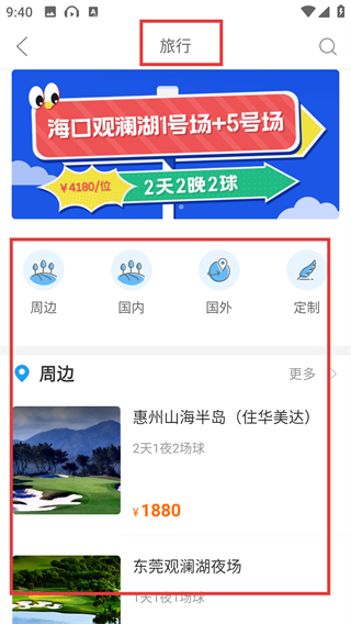 4、切換到【旅行】板塊,能看到各類高爾夫旅行套餐,比如周邊、國內的打球+住宿套餐,按需選擇很便捷。