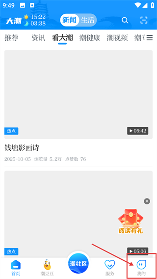 1、進入“大潮”APP首頁,瀏覽【看大潮】等板塊內容后,點擊底部導航欄的【我的】選項,即可進入個人中心頁面。