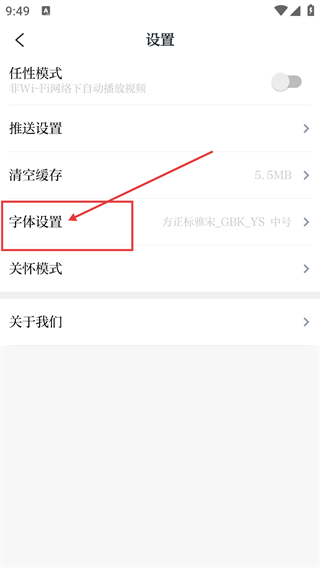 3、在設置頁面中,找到【字體設置】選項并點擊,該選項當前顯示【方正標雅宋_GBK_YS-中號】,點擊后進入字體調整界面。