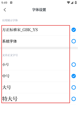 4、進入【字體設置】頁面,可選擇【方正標雅宋_GBK_YS】或【系統(tǒng)字體】,同時能將文章正文字號調整為小/中/大/特大號。