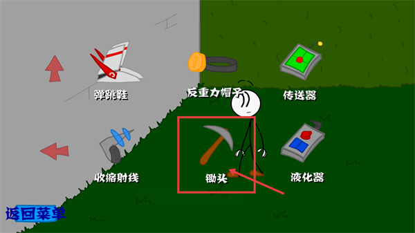 1、看到可選道具含【彈跳鞋】-【反重力帽子】-【傳送器】-【收縮射線】-【鋤頭】-【液化器】,當前選中【鋤頭】,助力后續潛入操作。