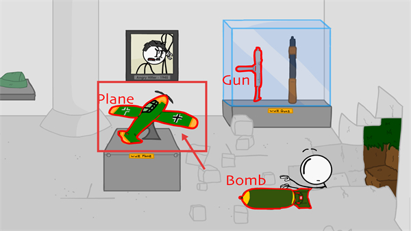 2、場景中出現可互動物品【Plane】-【Gun】-【Bomb】,分布在展臺與地面,需依潛入需求選對應物品,推進鉆石盜取流程。