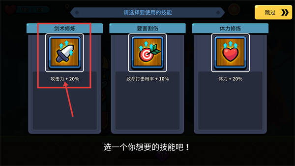 1、在技能選擇界面,選【劍術修煉】可獲【攻擊力+20%】加成,此技能適配輸出型流派,能有效提升后續戰斗的傷害效率。