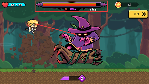 3、對戰紫色巫師BOSS時,關注其頂部血條數值【119.4】,持續操控角色攻擊BOSS,逐步消耗其血量推進戰局。