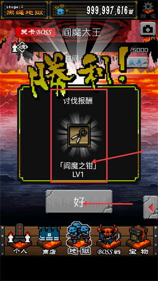 4、擊敗【閻魔大王】后獲得【討伐報酬-閻魔之鉗-LV1】,點擊【好】領取該道具,可用于提升角色戰力。