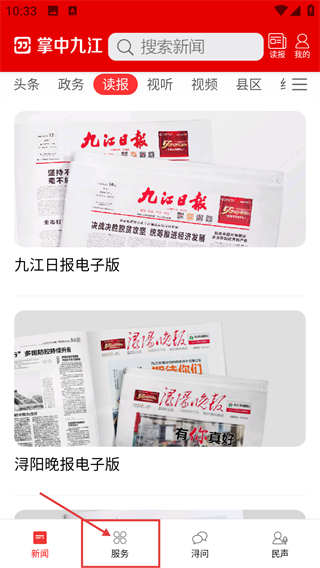 1、進(jìn)入【掌中九江】的讀報頁面后,點擊底部導(dǎo)航欄的【服務(wù)】選項,即可進(jìn)入生活服務(wù)與政務(wù)服務(wù)的功能板塊。