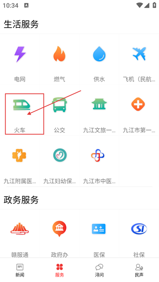 2、進(jìn)入服務(wù)頁面后,在【生活服務(wù)】板塊中找到【火車】選項并點擊,可進(jìn)入鐵路相關(guān)的服務(wù)界面。