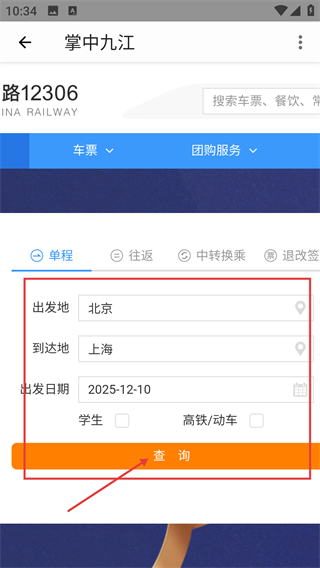 3、進(jìn)入鐵路服務(wù)界面后,填寫【出發(fā)地】【到達(dá)地】【2025-12-10】等信息,點擊【查詢】按鈕獲取車票信息。