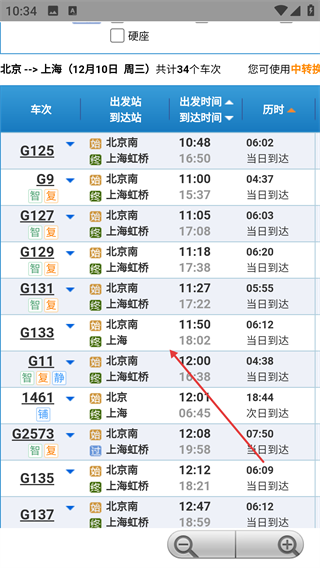 4、點擊查詢后,頁面會展示對應(yīng)日期的車次列表,可查看【G125】等車次的出發(fā)時間、到達(dá)時間及歷時等信息。