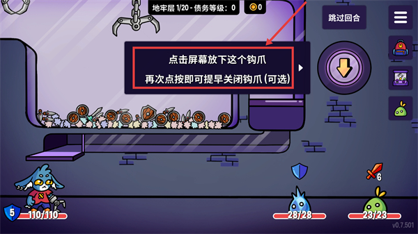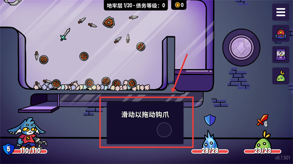 2、滑動(dòng)屏幕拖動(dòng)鉤爪調(diào)整位置,瞄準(zhǔn)目標(biāo)物品后抓取,優(yōu)先獲取武器或盾牌類道具增強(qiáng)初期戰(zhàn)力。
