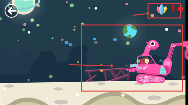 4、進入太空場景,操控【粉色挖掘機】繼續作業,此時右上角【鉆石-14】,需持續完成作業以積累更多鉆石資源,留意場景內的可收集物。