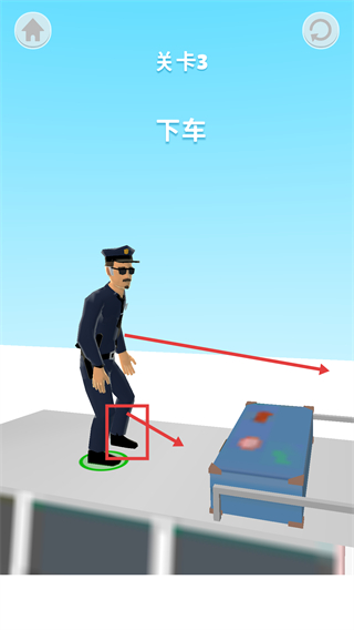 1、進入【關卡3-下車】場景,操控警察角色向藍色箱子方向移動,跟隨綠色區域的指引推進關卡進程。