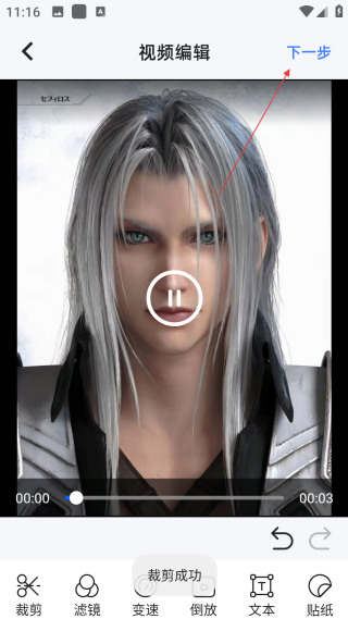 4、在裁剪成功后,點擊右上角【下一步】,即可繼續進行后續的視頻編輯操作。