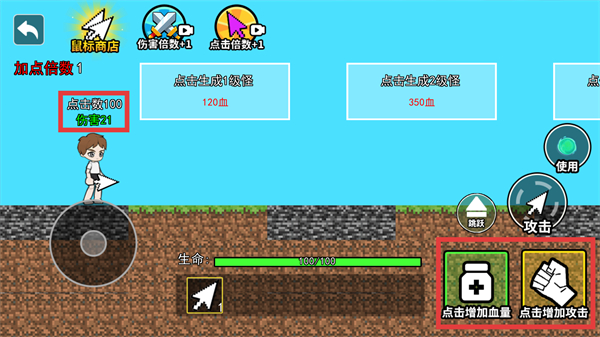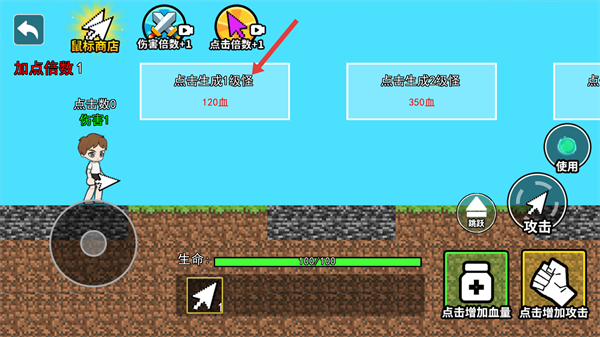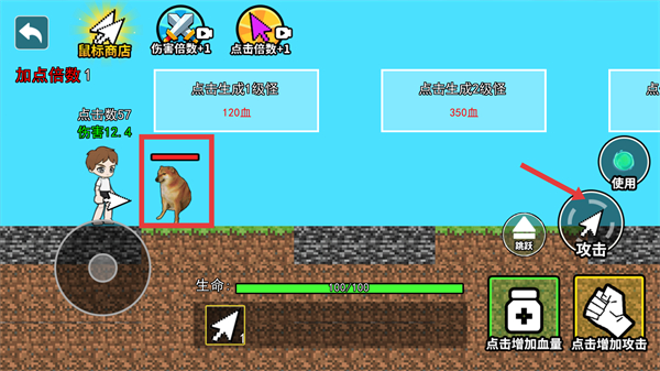 4、對戰過程中,可點擊界面下方的【點擊增加血量】【點擊增加攻擊】按鈕,提升自身屬性以增強戰斗能力。