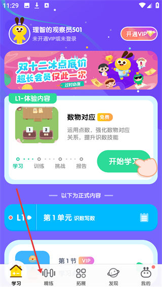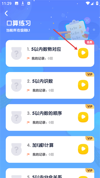 3、進入【口算練習(xí)】頁面,看到【5以內(nèi)數(shù)物對應(yīng)】為免費內(nèi)容,點擊其右側(cè)的播放按鈕,即可開啟該練習(xí)。