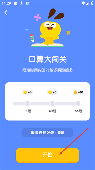 4、進入【口算大闖關(guān)】頁面,該頁面顯示不同答題量對應(yīng)的獎勵,點擊底部的【開始】按鈕,即可參與此次闖關(guān)挑戰(zhàn)。