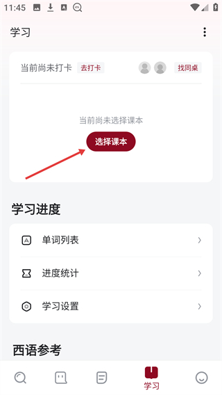 2、進入學習頁面后,看到【當前尚未選擇課本】的提示,點擊【選擇課本】按鈕,就能進入課本選擇的頁面。
