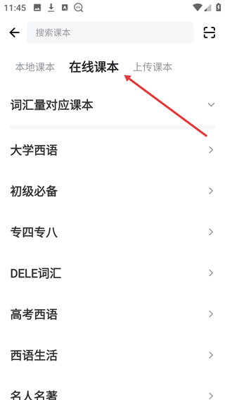 3、進入課本選擇頁面后,切換到【在線課本】標簽頁,可看到【大學西語】【初級必備】等多個課本分類選項。