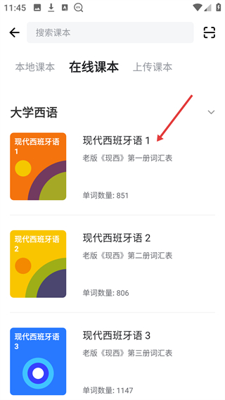 4、在【大學西語】分類下,選擇【現代西班牙語1】,點擊即可選定該課本用于學習。