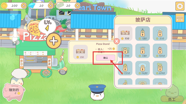 1、看到【Pizza-Stand】的解鎖界面,其花費(fèi)【150】且收入【+25】,點(diǎn)擊【確認(rèn)】按鈕,即可解鎖該攤位提升【LV-1】的經(jīng)營(yíng)等級(jí)。