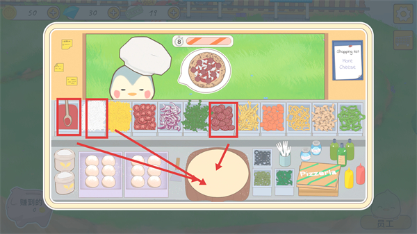 3、進(jìn)入披薩制作界面,選擇【醬料】-【面粉】等對(duì)應(yīng)食材,添加到制作臺(tái),完成披薩的制作以供應(yīng)攤位需求。