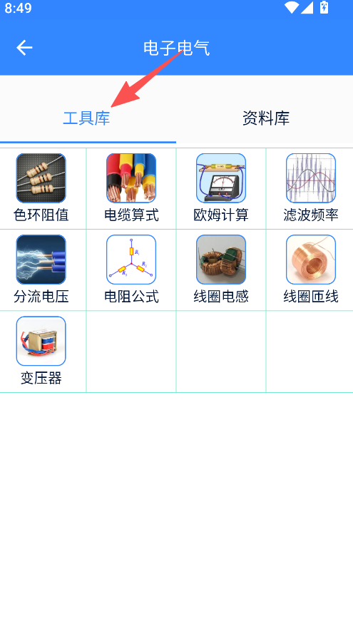 2、進入電子電氣頁面,選擇工具庫中的色環阻值功能。