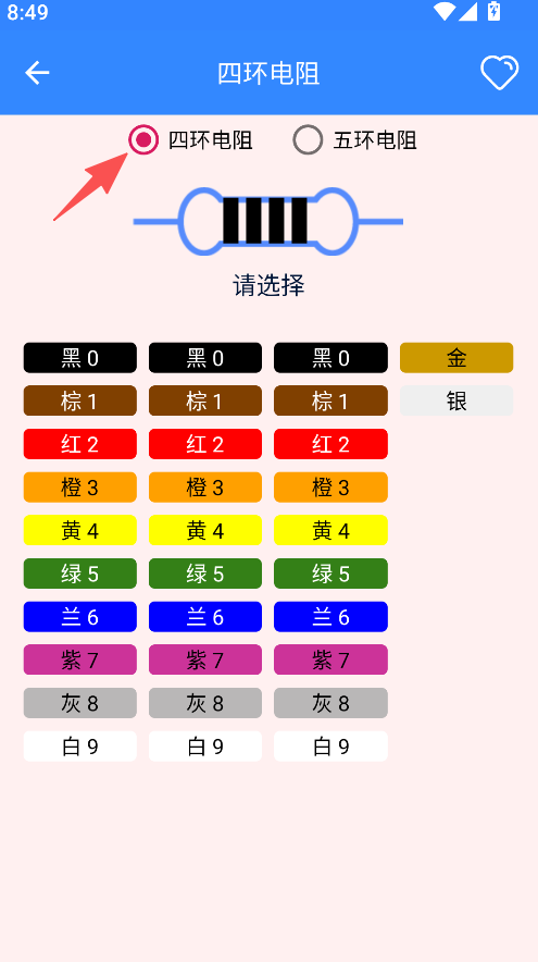 3、具備電阻參數選擇功能,在四環電阻頁面選擇對應顏色,確定電阻的相關參數信息。