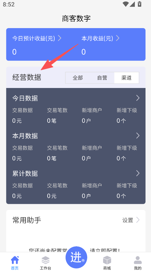 1、打開《商客數字》首頁,查看經營數據中的今日本月數據。