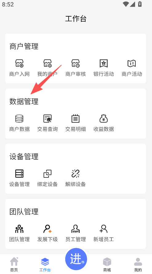 2、工作臺細分多類管理模塊,含商戶管理數據管理等,每個模塊對應不同的經營管理操作需求。