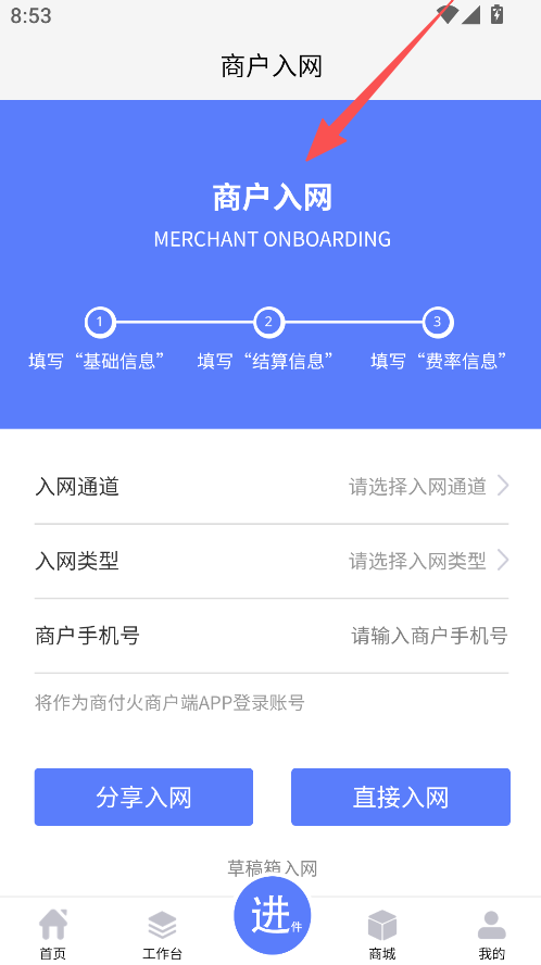 3、在商戶入網頁面,填寫信息后選擇分享入網或直接入網。