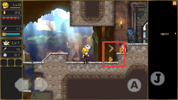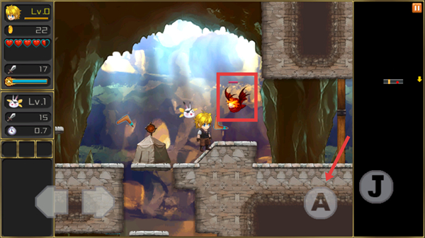 2、遇到【紅色魔物】時(shí),點(diǎn)擊【A】鍵觸發(fā)戰(zhàn)斗互動(dòng),擊敗魔物以提升角色等級(jí)(如升至【Lv-1】)。