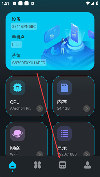 1、在設備信息頁面,可查看手機的硬件參數(CPU、內存等),點擊底部功能按鈕,可進入工具選擇界面,包含各類計算工具。