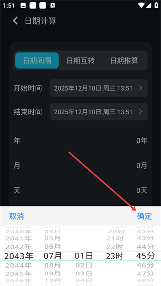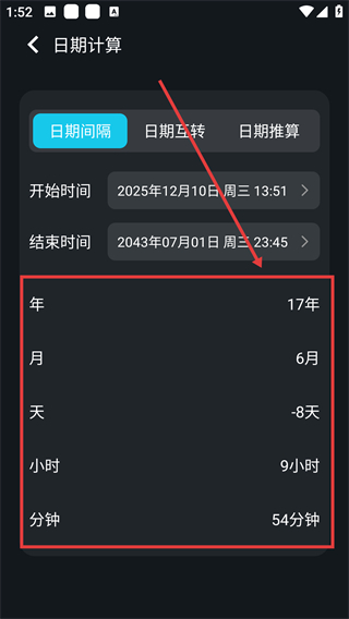 4、設置時間后,系統將自動計算并展示兩個日期之間的年、月、天、小時、分鐘間隔,可直接查看計算結果。