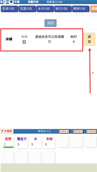 3、收集【木材】3個,點擊【建造】按鈕制作床鋪,通過休息恢復體力,保障生存基礎需求。