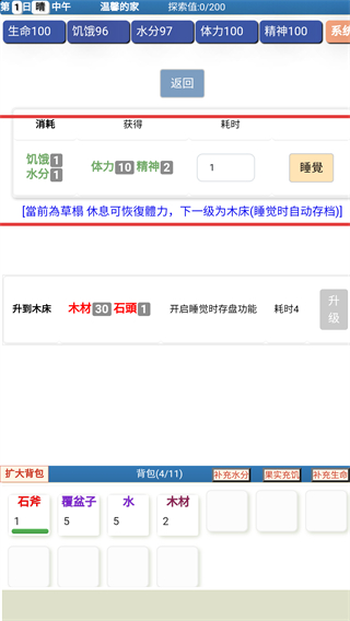 4、消耗【木材】30和【石頭】1升級木床,開啟睡覺存檔功能,提升生存效率與游戲體驗。