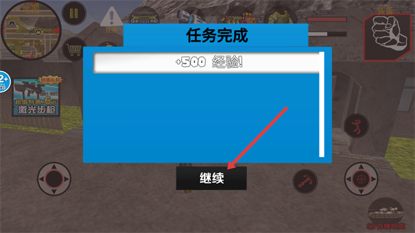 4、完成任務后獲得【+500經(jīng)驗!】獎勵,點擊【繼續(xù)】按鈕進入后續(xù)跑酷關卡挑戰(zhàn)。