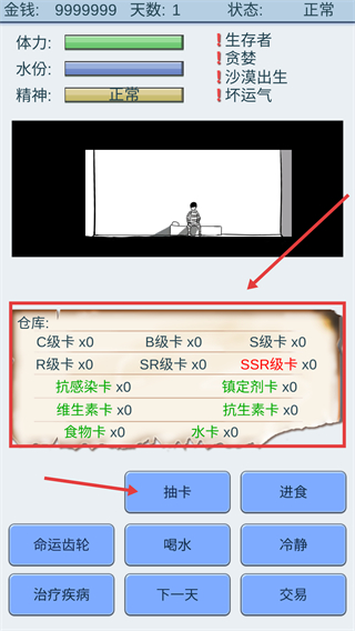 1、通過抽卡獲取食物、水、藥物等生存資源,同時留意體力與精神消耗,平衡抽卡頻率與生存狀態。